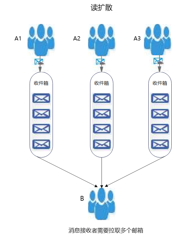 如上图所示,用户B与每个聊天的人(A1,A2,A3)都有一个信箱(一种数据结构的抽象,用于存储消息),B在查看聊天信息时需读取所有有新消息的信箱。IM系统里的读扩散通常是每两个相关联的人就有一个信箱。