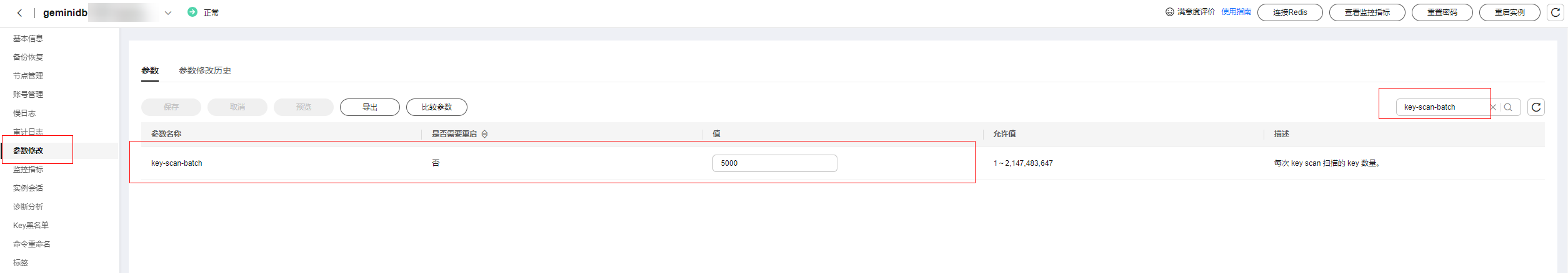 - 如何加快key扫描统计:参考修改当前实例的参数在实例基本信息页,单击左侧导航栏的“参数修改”,搜索“key-scan-batch”并调大。key-scan-batch会消耗CPU,调整的值越大消耗的CPU越多。迁移场景对比key数量可临时调大加快统计,迁移完成后建议恢复默认值避免消耗过多CPU,跟在线业务形成资源争抢。