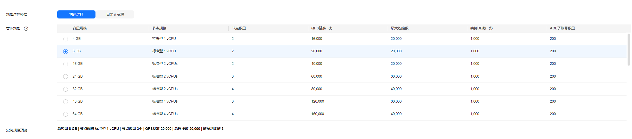 集群版实例支持快速选择和自定义资源两种规格选择模式。