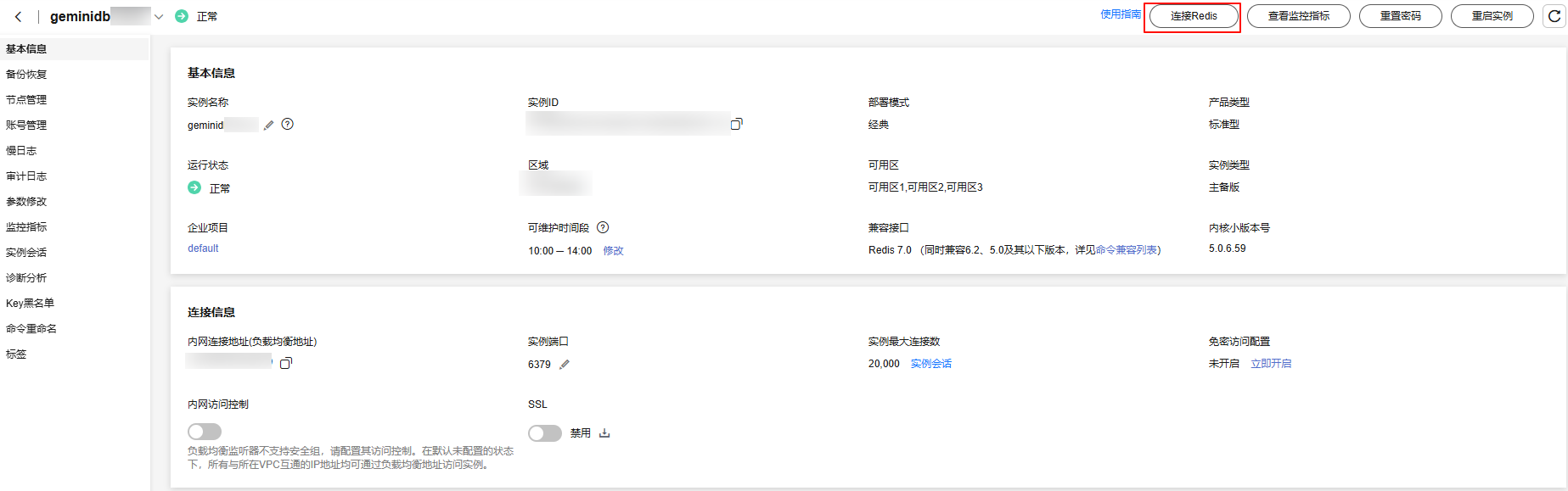 您也可以单击实例名称,进入“基本信息”页面,在页面右上角单击“连接Redis”。