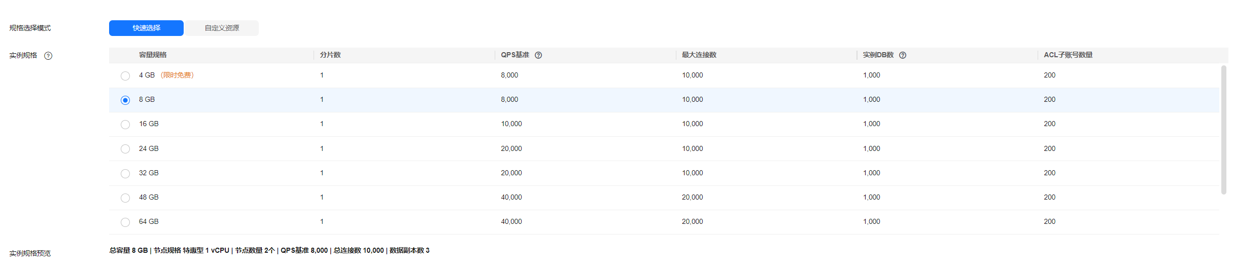 实例支持快速选择和自定义资源两种规格选择模式。 |