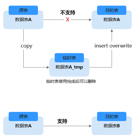 - insert overwrite语法不适用于同一张表内部的“自读自写”场景(包括分区表和非分区表),直接在原表上执行insert overwrite可能会导致数据丢失或数据不一致的风险。