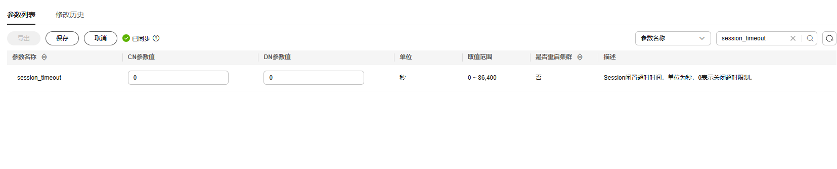 - 单击“参数修改”页签,在“参数列表”中找到“session_timeout”查看超时时间参数。