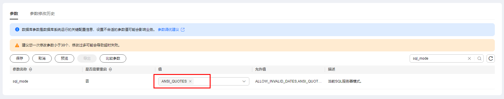 查看实例的“sql_mode”参数值包含“ANSI_QUOTES”。