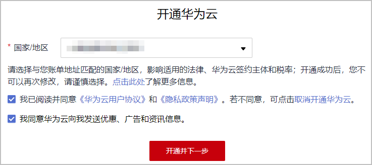- 再次确认或修改国家/地区,勾选服务条款,单击“开通并下一步”。