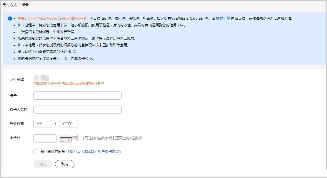 绑卡期间,华为云为了验证信用卡的有效性,会向您的信用卡收取1美元(付款货币设置为非美元时,会根据汇率扣除换算后的同等金额)的授权保证金,该授权保证金将在绑卡成功后立即返还到您的信用卡中,具体返还时间以银行为准。