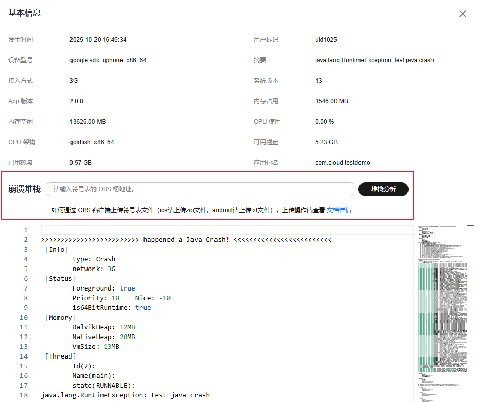 - 单击“设备型号/ID”列的某一行对应的“操作”列的“查看详情”,展示该崩溃记录的基本信息以及崩溃堆栈。