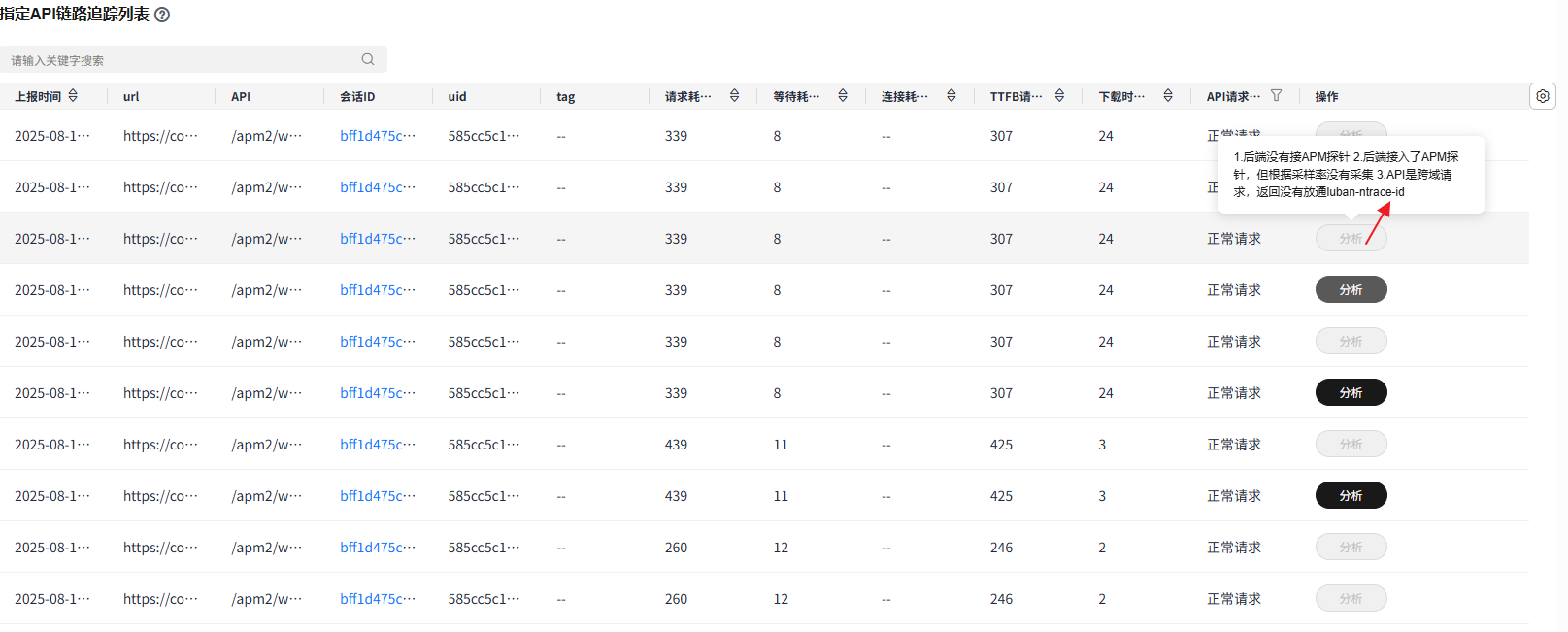 - 指定API链路追踪列表:展示指定API链路追踪列表。展示指标包括:上报时间、url、API、设备ID、会话ID、uid、tag、附加信息、请求耗时、等待耗时、连接耗时、TTFB请求时间、下载时间、API请求状态、状态码以及后台信息。