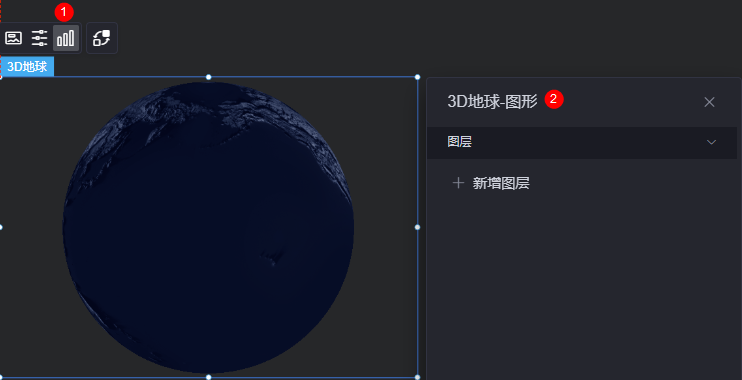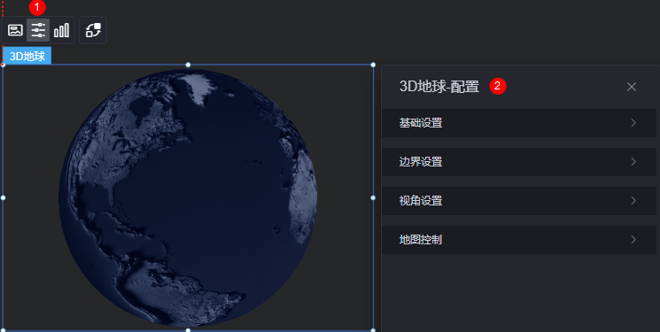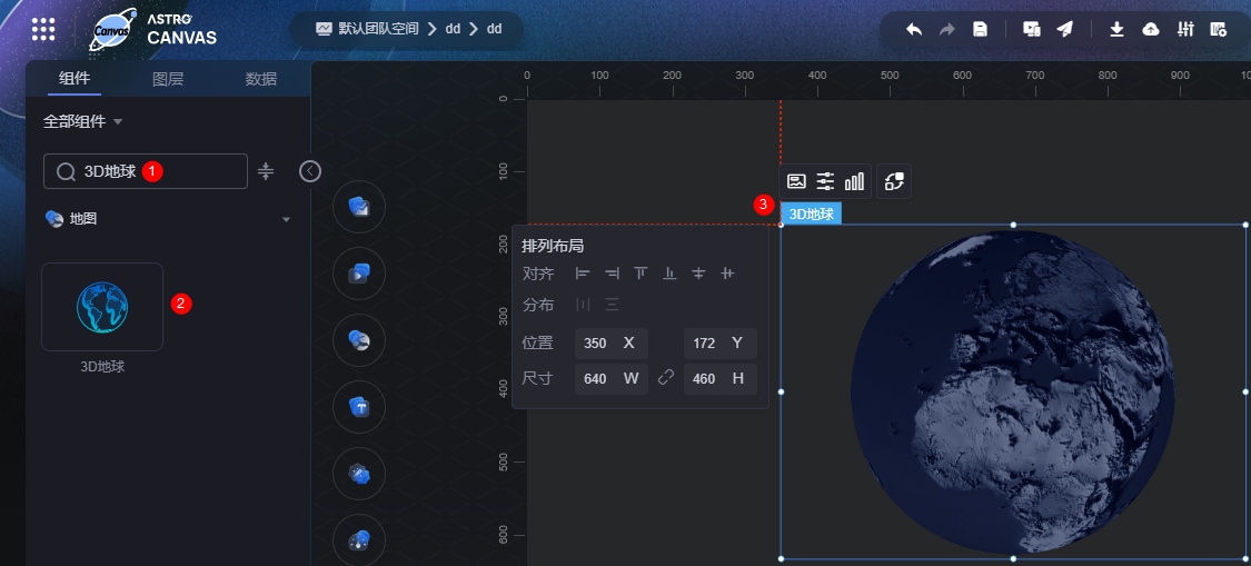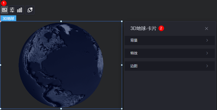 在大屏设计页面,从“地图”中,拖拽“3D地球”组件至画布空白区域,如图1。