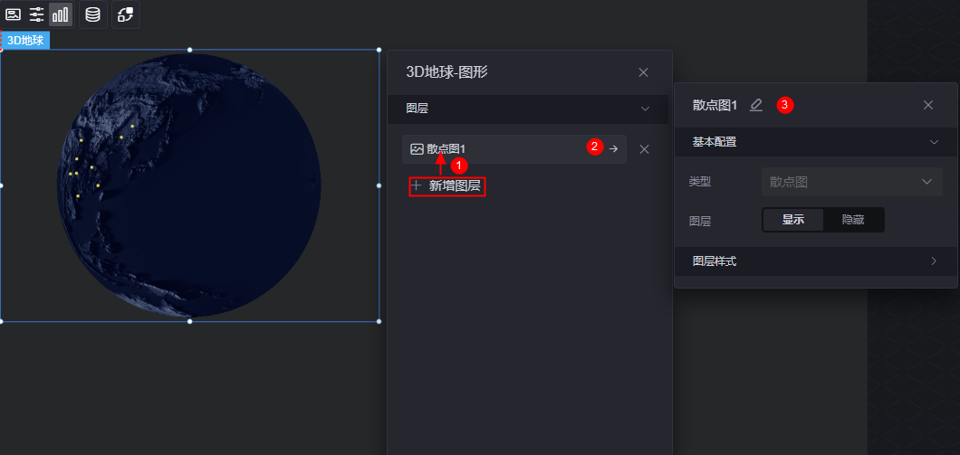 在数据中,配置3D地球组件的数据来源,更多介绍请参见数据接入。