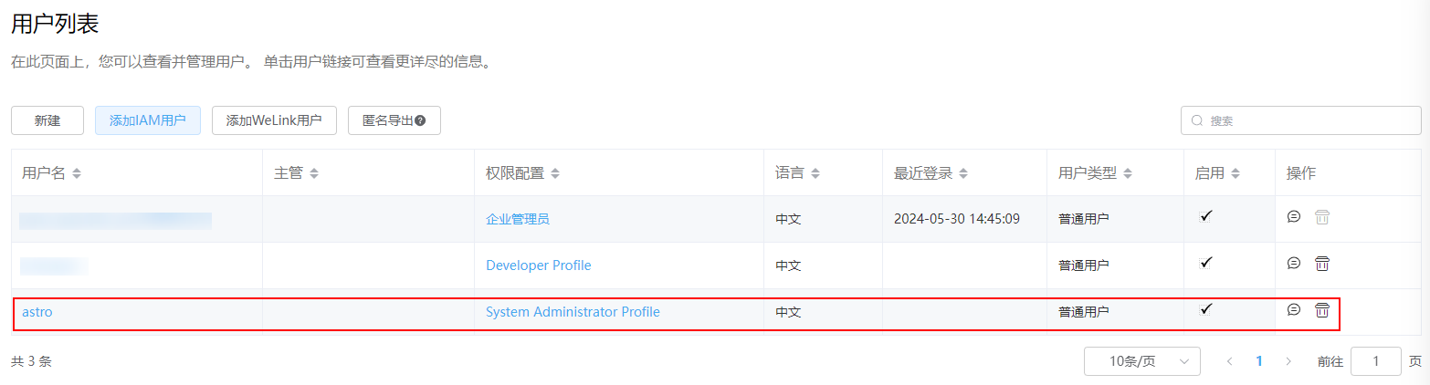 在用户列表中,可查看到已添加的IAM用户,且权限显示为System Administrator Profile。
