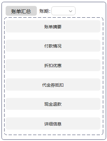- 账单摘要:展示客户当前账期、账单状态(是否已出账)、到期还款日、总共实际消费金额(不含代金券抵扣费用)。