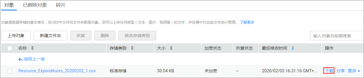 - 客户从“费用中心 > 账单管理 > 消费数据存储”页面订阅“资源消费记录”账单后,可以从“服务列表 > 存储 > 对象存储服务”中进行下载并查看。