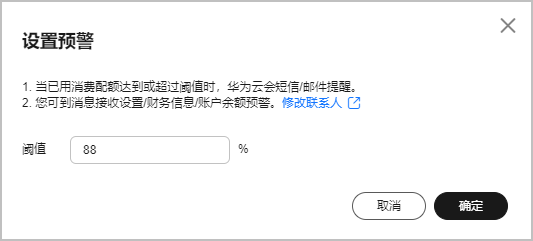 - 若您的已用消费配额达到或超过预警阈值(默认80%,可配置)时,华为云将发送短信/邮件提醒您。