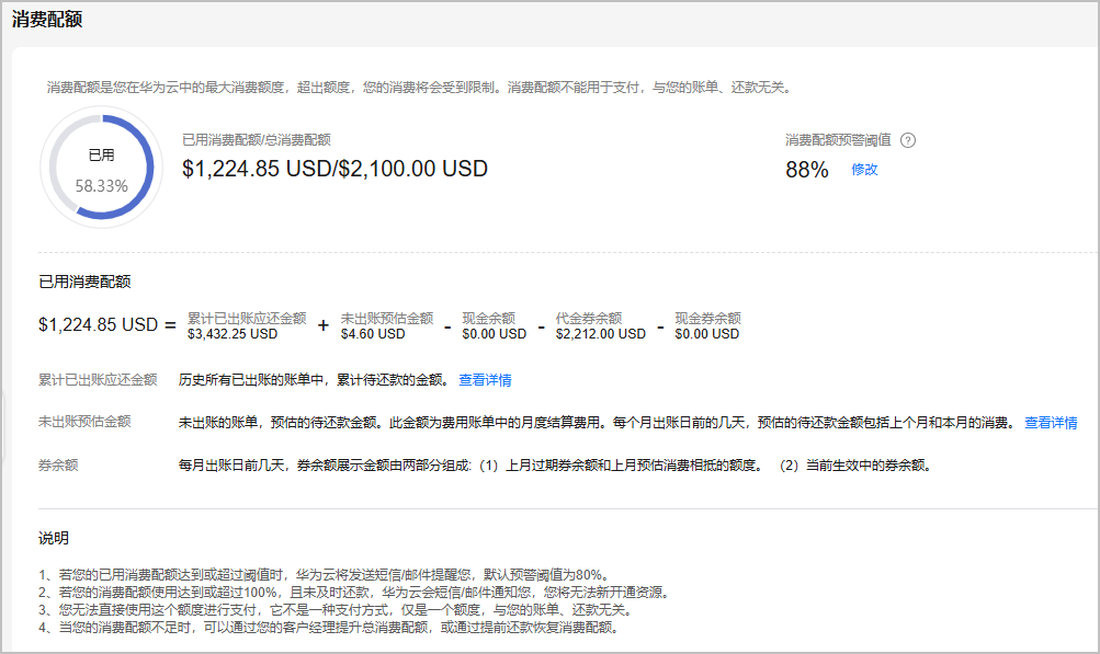 - 当已用为100%或大于100%时,表示消费配额已用完,系统会自动从您绑定信用卡中扣款,扣款成功后,即可恢复您的消费配额。