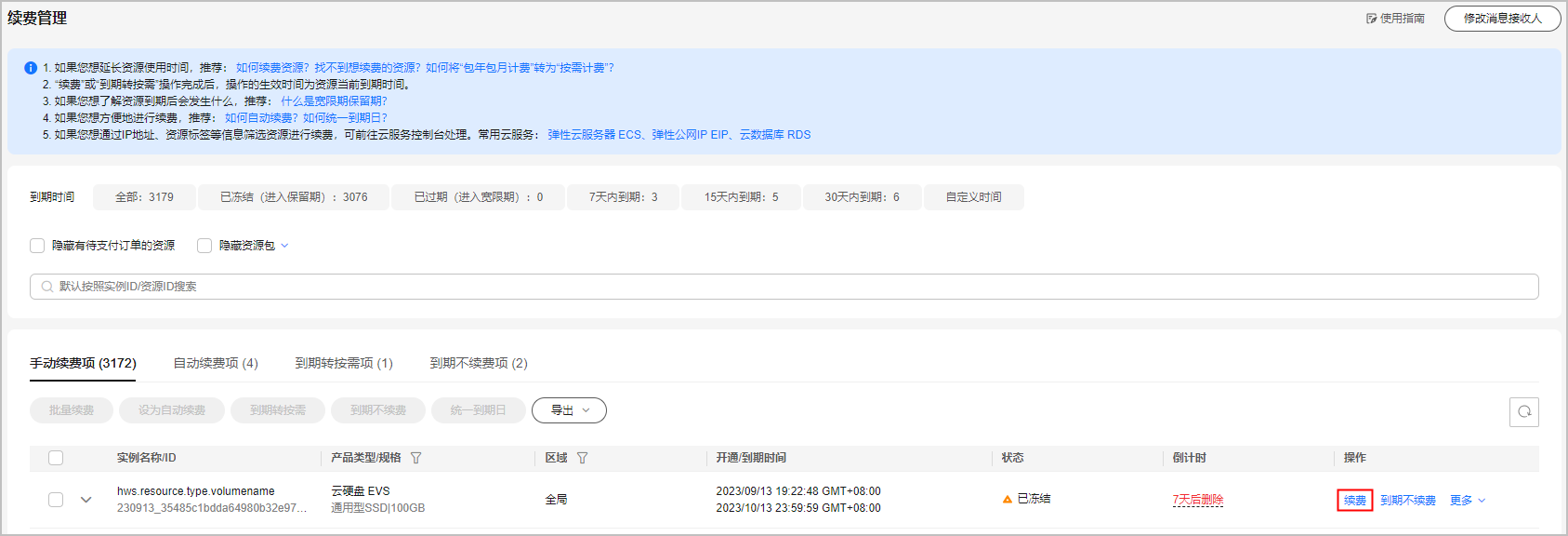 - 所有需手动续费的实例都可归置到“手动续费项”页签,详情请参见如何设为手动续费。
