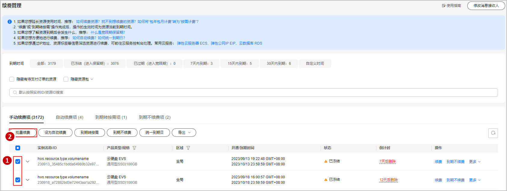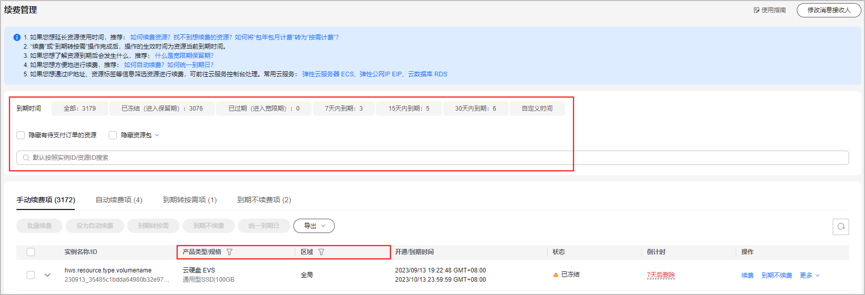 - 续费管理支持根据实例状态、到期时间、实例ID、实例名称、订单号、产品类型、区域筛选实例。开通企业项目管理的客户还可以根据企业项目筛选实例。