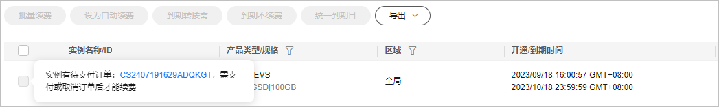 若实例有待支付订单,需完成支付或取消订单后才能操作续费。可单击提示框的订单号进入订单页面,完成支付或取消该订单后,该实例将恢复可续费状态。