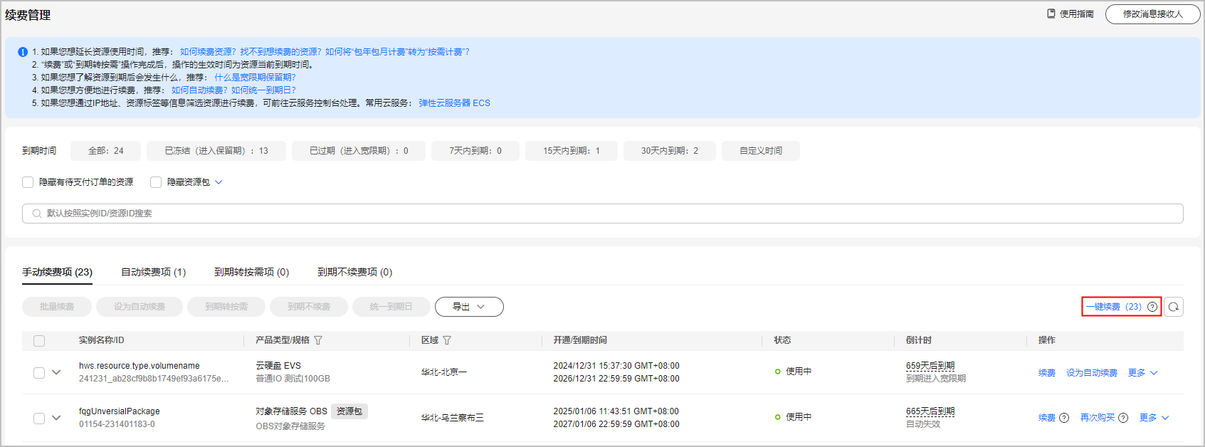 - 单击续费列表右上角“一键续费”,默认对“手动续费项”页签下所有可续费的实例创建一键续费任务。