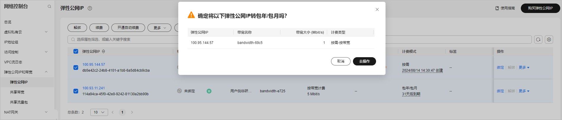 以“弹性公网IP”为例,介绍如何按需转包年/包月。