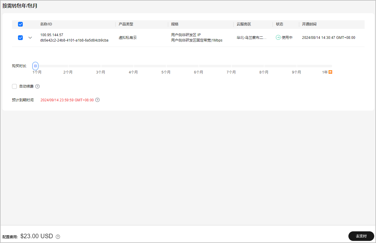 - 选择购买时长,确认是否设置自动续费、预计到期时间和配置费用后,单击“去支付”。