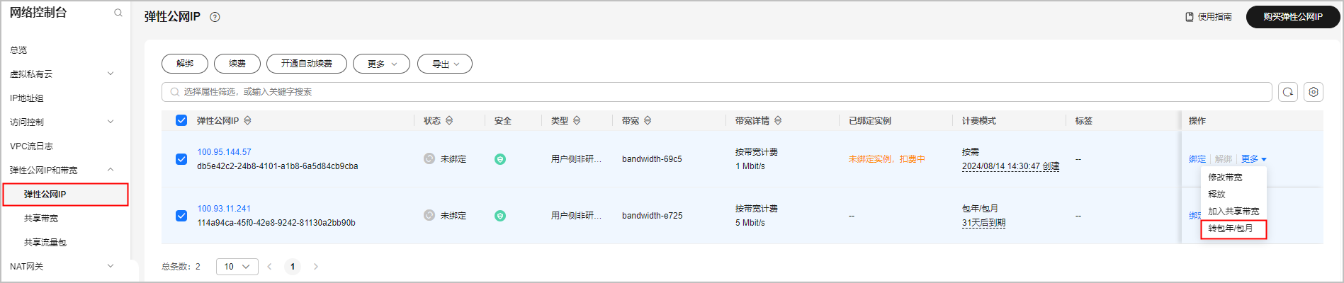 系统支持批量转包年/包月操作,即一次将多个按需计费的弹性公网IP变更为包年/包月计费模式。操作如下: