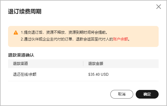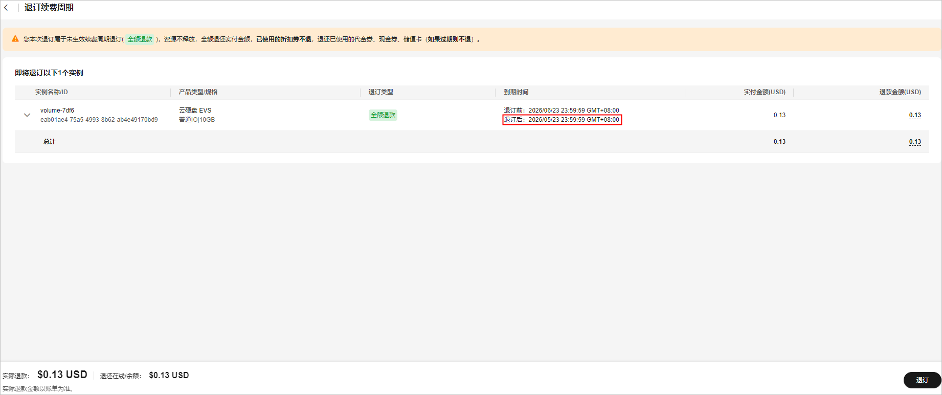 - 查看退订信息:选择退订后的到期时间,查看退款金额明细,确认退订续费周期,单击“退订”。