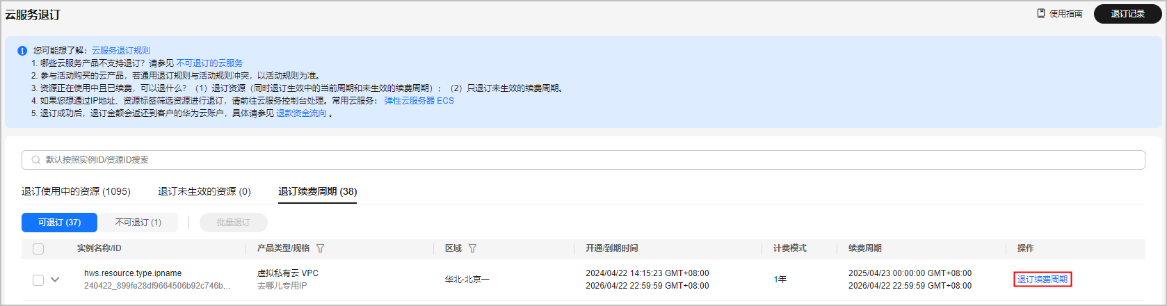 - 退订已生效的续费周期,属于退订使用中的资源,退订规则请参考退订使用中的资源。