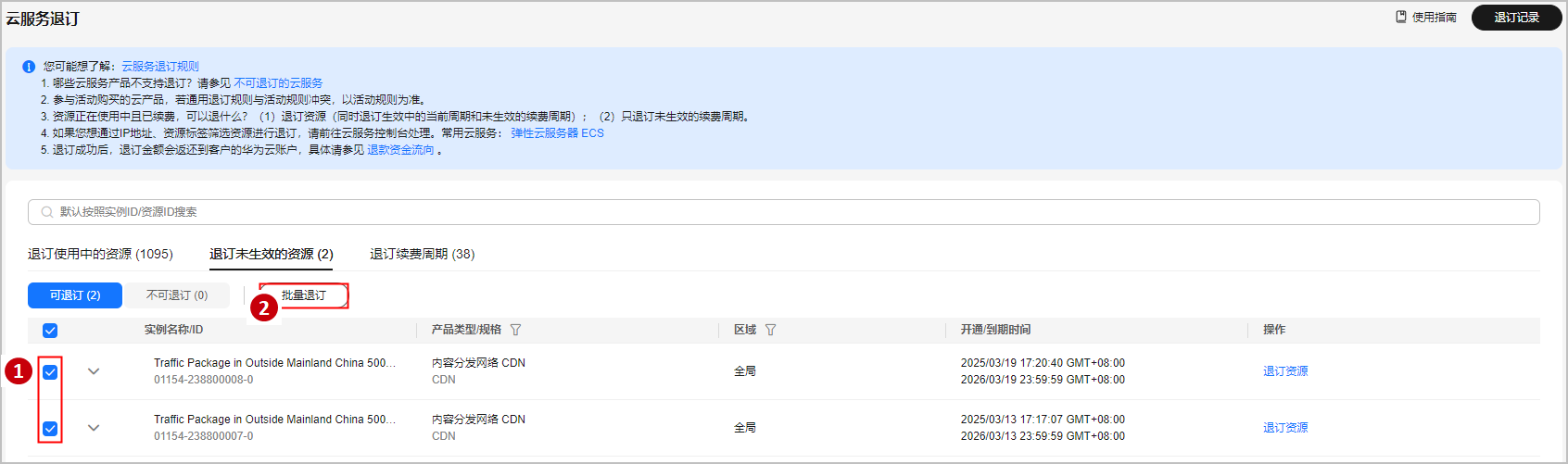 - 批量退订多个未生效实例:勾选需要退订的实例,单击列表左上角的“批量退订”。