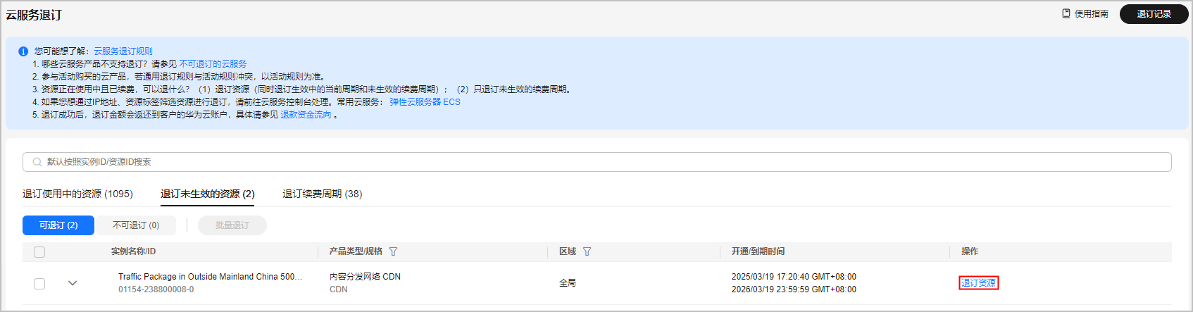 - 退订单个未生效实例:单击待退订实例操作栏“退订资源”。