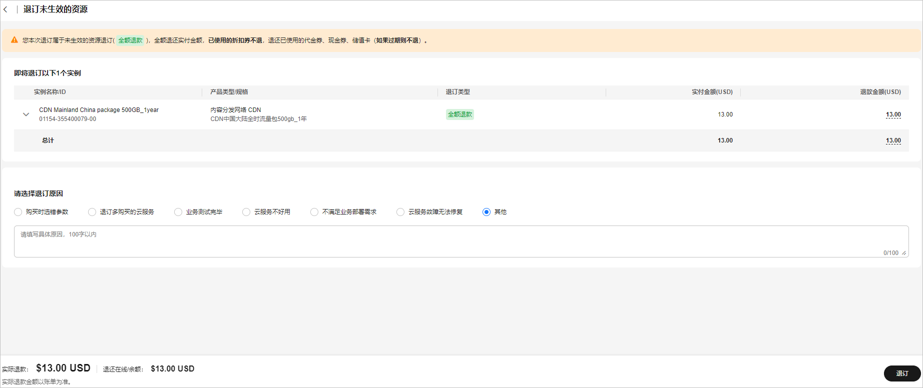 - 查看退订信息和退款金额明细。选择退订原因,单击“退订”。