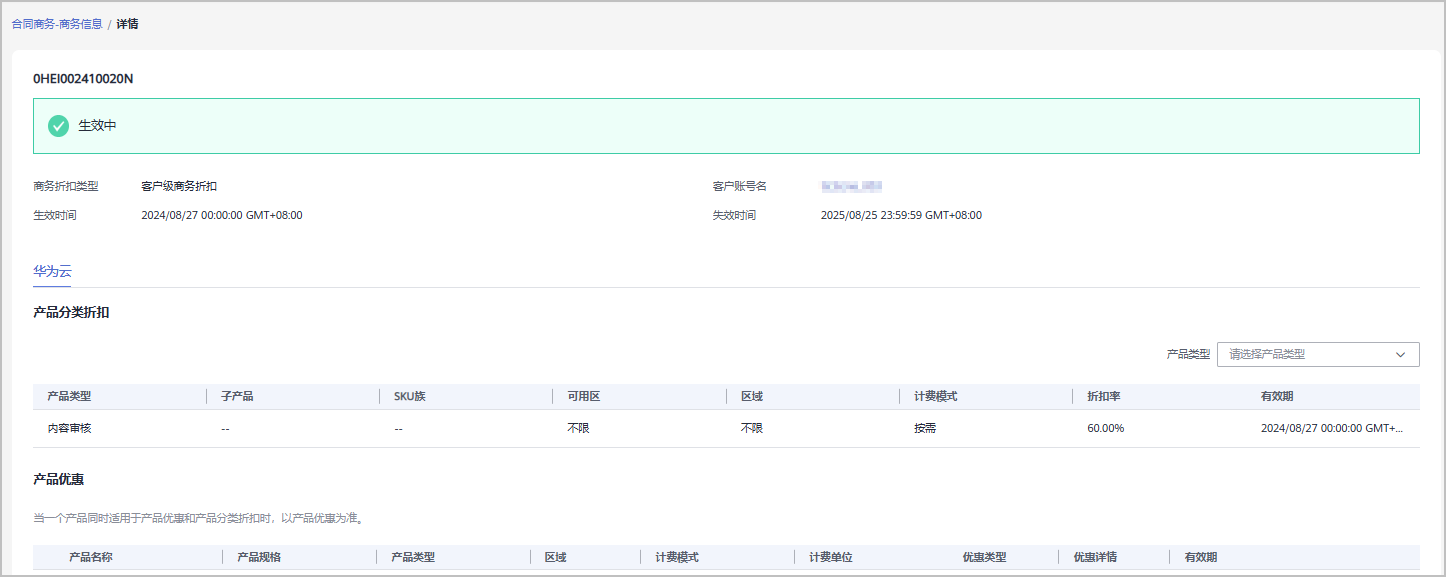 - 单击商务折扣ID,进入商务折扣详情页,查看商务折扣具体信息、产品分类折扣和产品优惠信息。
