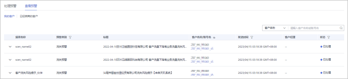 - 华为云总经销商查看预警时请根据实际需要在“客户 > 客户预警 > 查看预警”页面先选择“我的客户”或者“云经销商的客户”页签,再进行预警查看。