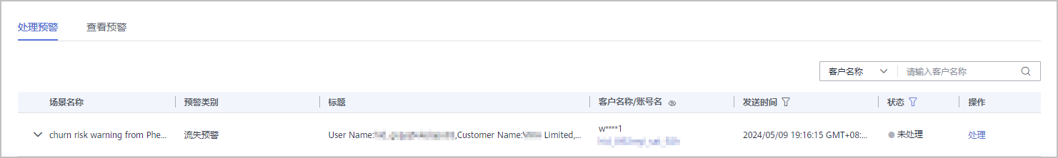 4. 选择“处理预警”页签,可以查看场景名称、预警类别、标题、客户名称/账号名、发送时间和状态。