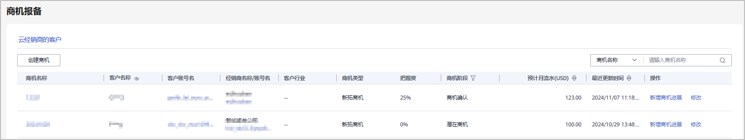 合作伙伴可以查询其名下的所有子客户和云经销商关联的所有子客户,以及查看子客户的客户行业、商机类型、把握度、商机阶段、预计月流水、最近更新时间等。
