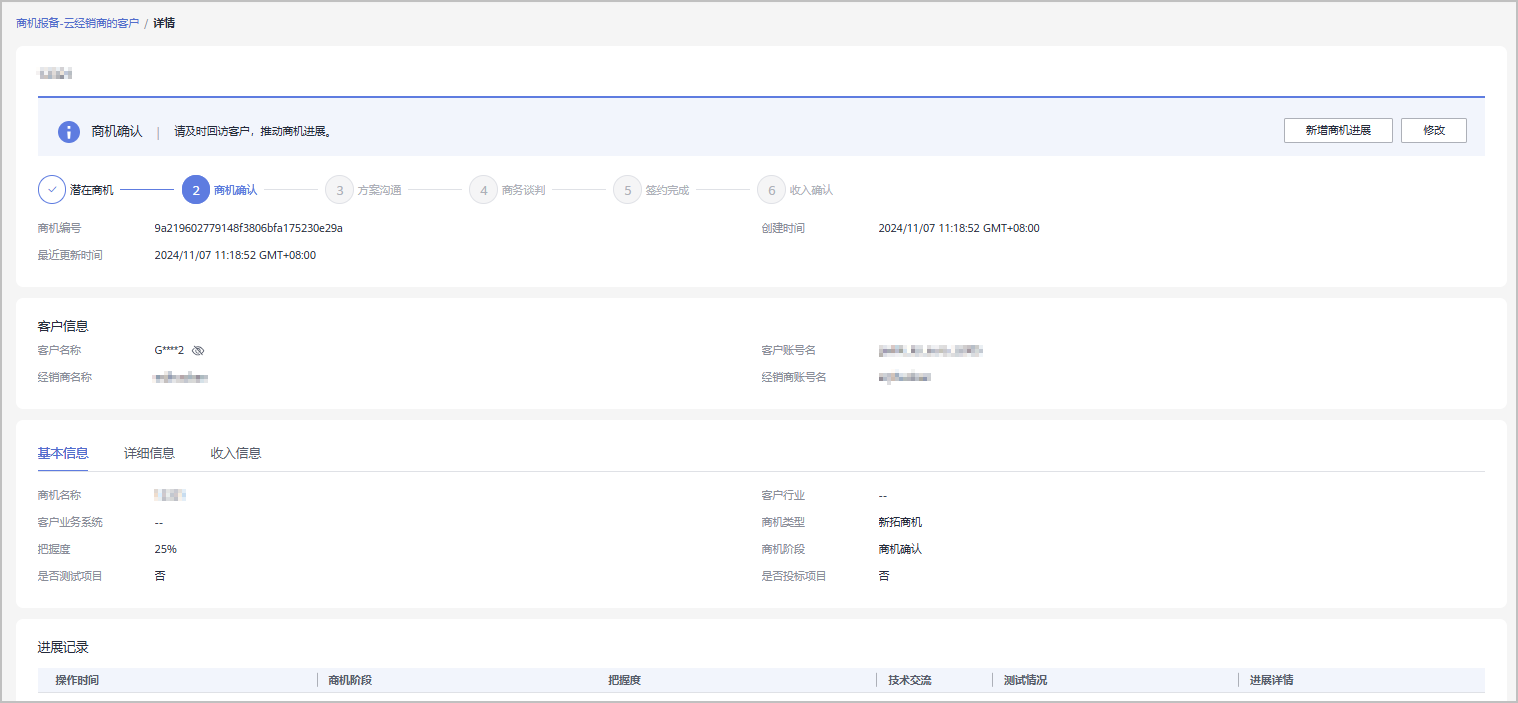 - 单击“详细信息”,可查看“详细信息”页签的客户上云情况和商机运作。
