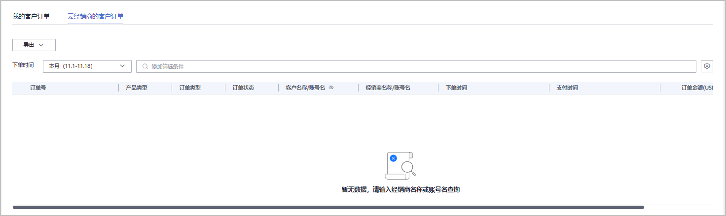 总经销商伙伴可以查询名下客户和名下云经销商的客户购买的包年/包月产品所生成的订单数据,并可将其导出至本地以供线下查看。