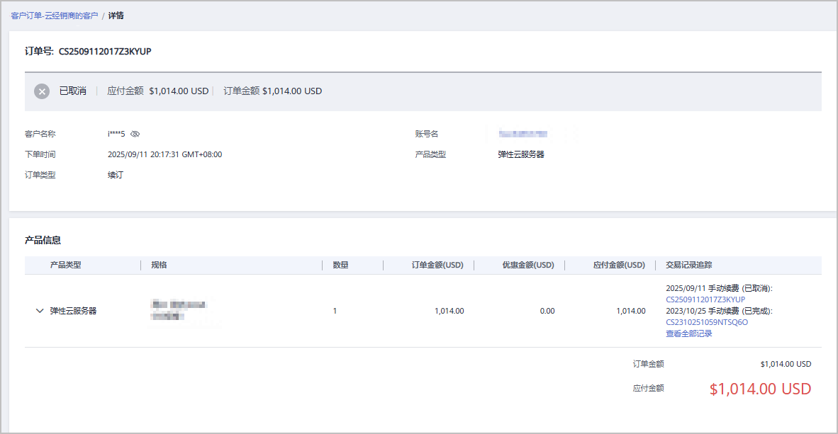- 如果订单从包年/包月转换为按需订单,或者客户取消订单,您可以通过“交易记录跟踪”字段查看原始订单信息。如果交易记录超过两条,可以点击“查看全部记录”来查看所有交易记录。