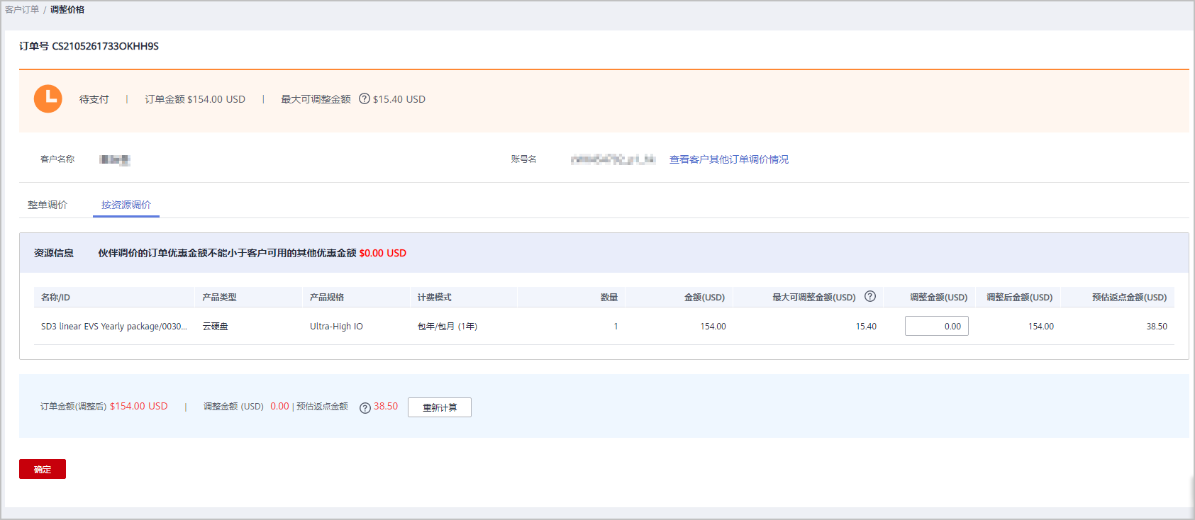 在“按资源调价”页签下,伙伴可以针对单个订单项,根据单个订单项的“最大可优惠金额”输入单个订单行的“优惠金额”。