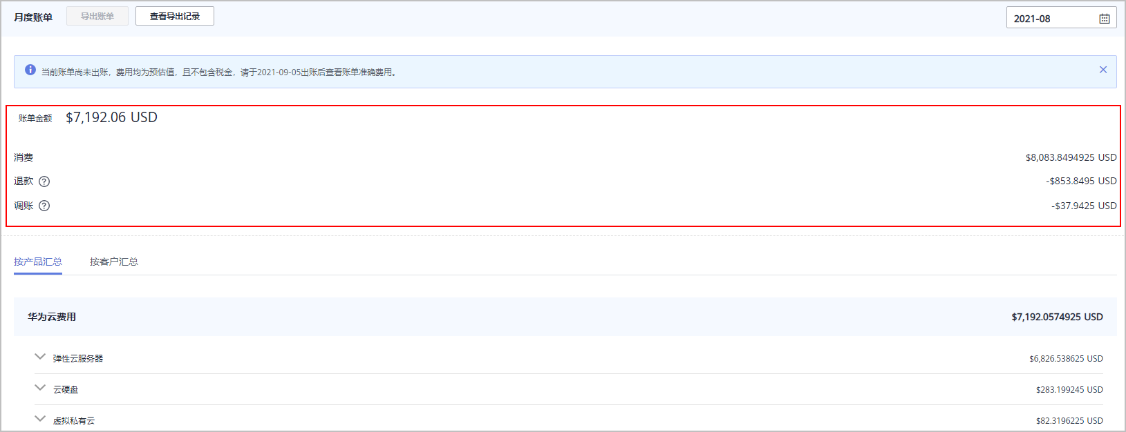 - 2021年6月份和7月份,持续性消费(如:按需、竞价实例等)在明细进行四舍五入后再汇总得到总计金额。