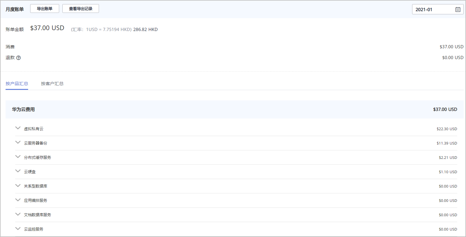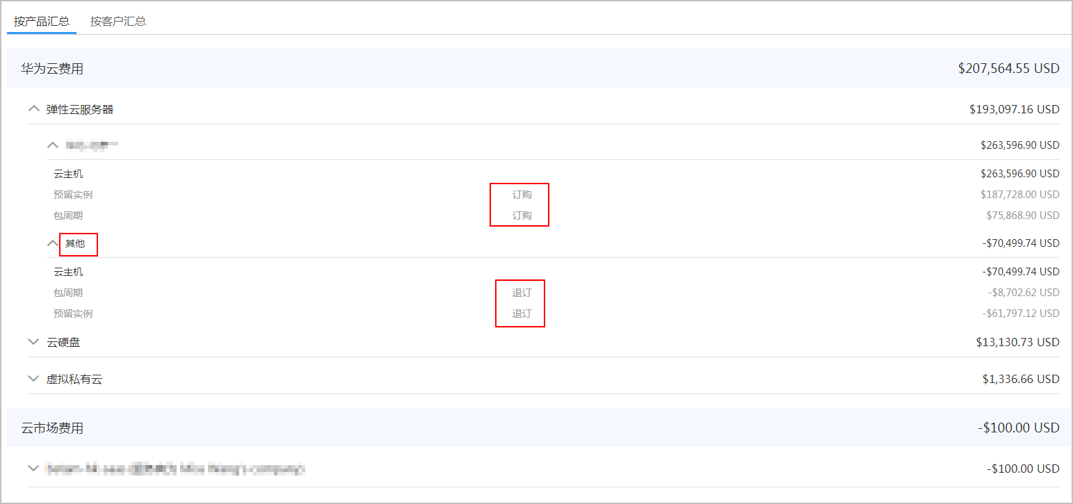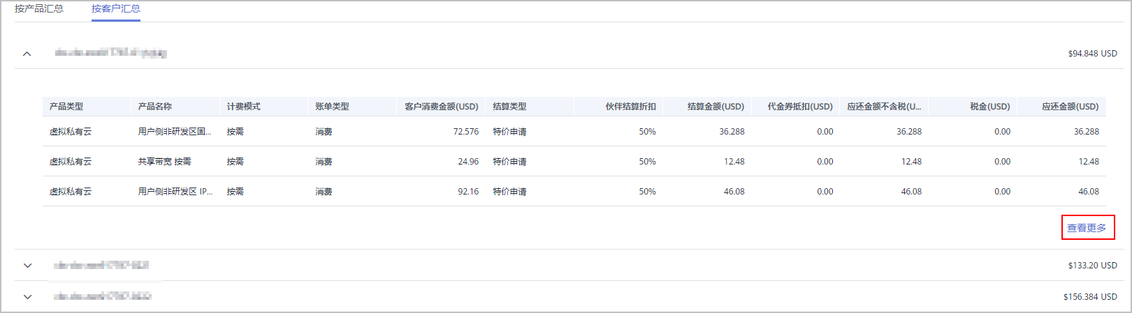 - 伙伴可以按照产品汇总或客户汇总查看月度账单明细。