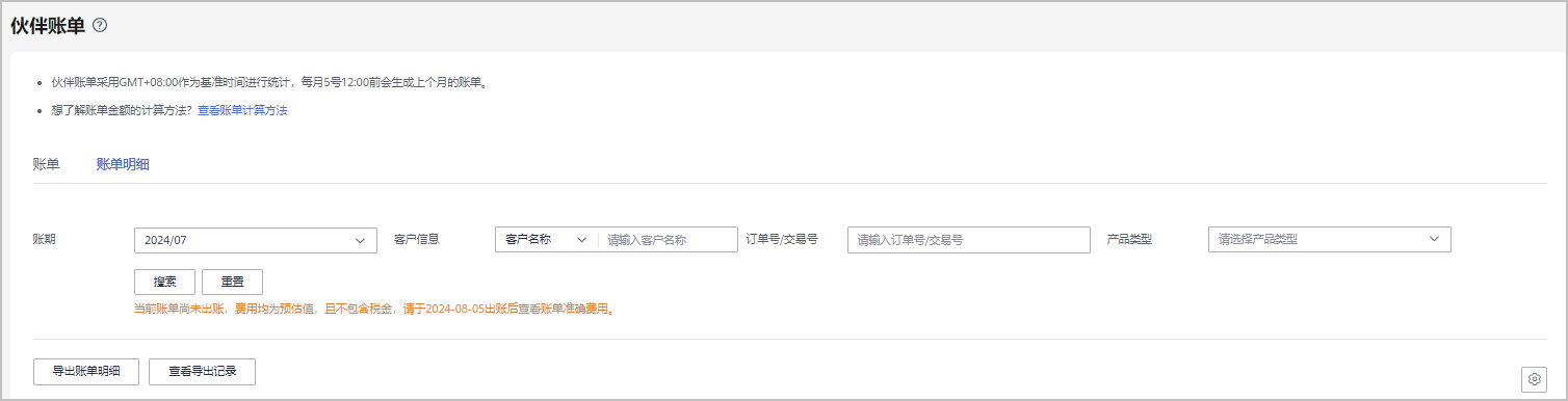 单击“导出账单明细”,页面提示“导出任务创建成功”。
