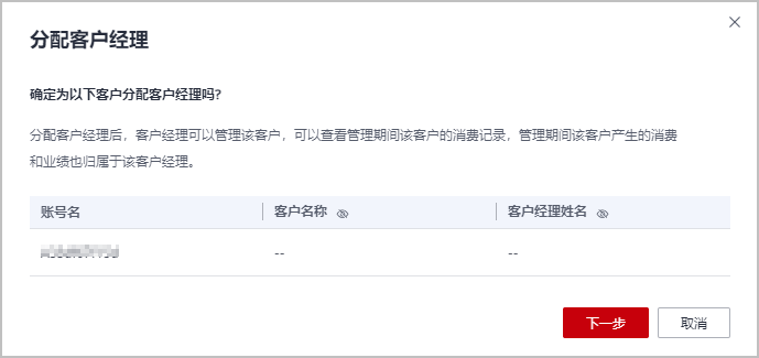 - 在“客户列表”中选择客户后,单击“操作”列的“更多 > 分配客户经理”,进入分配客户经理页面,单击“下一步”。