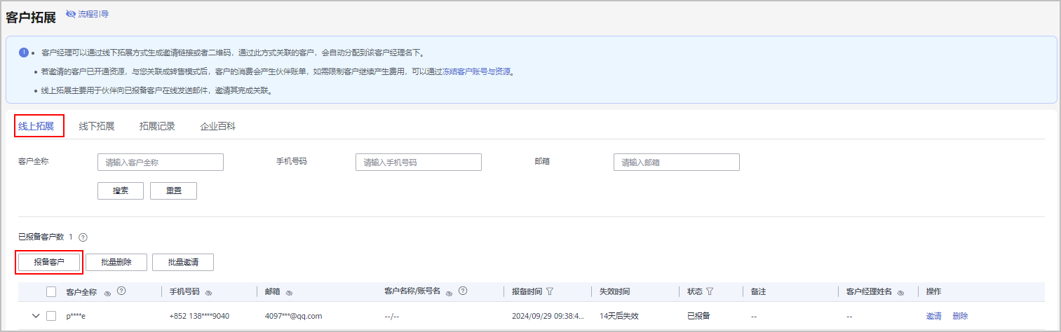- 在“线上拓展”页签,单击“报备客户”,进入“报备客户”页面。