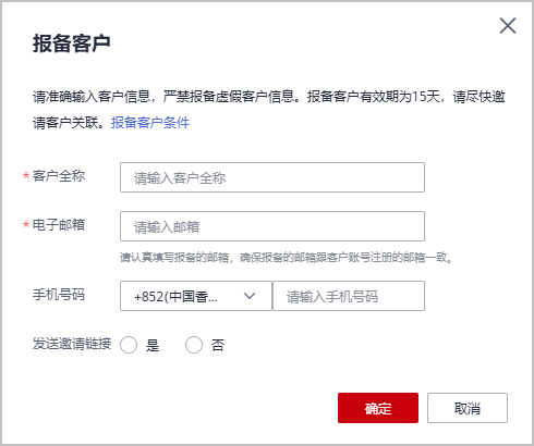 ,伙伴可以查看或隐藏字段的完整内容,内容默认隐藏。比如,单击“手机号码”旁边的眼睛按钮,可以查看或隐藏手机号码的完整内容。 - 输入客户全称、手机号码和电子邮箱,选择是否发送邀请链接,单击“确认”,系统提示报备成功信息。