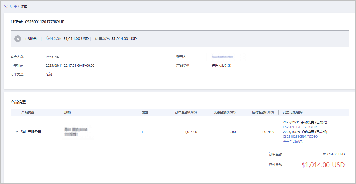 如果订单从包年/包月转换为按需订单,或者客户取消订单,您可以通过“交易记录跟踪”字段查看原始订单信息。如果交易记录超过两条,可以点击“查看全部记录”来查看所有交易记录。