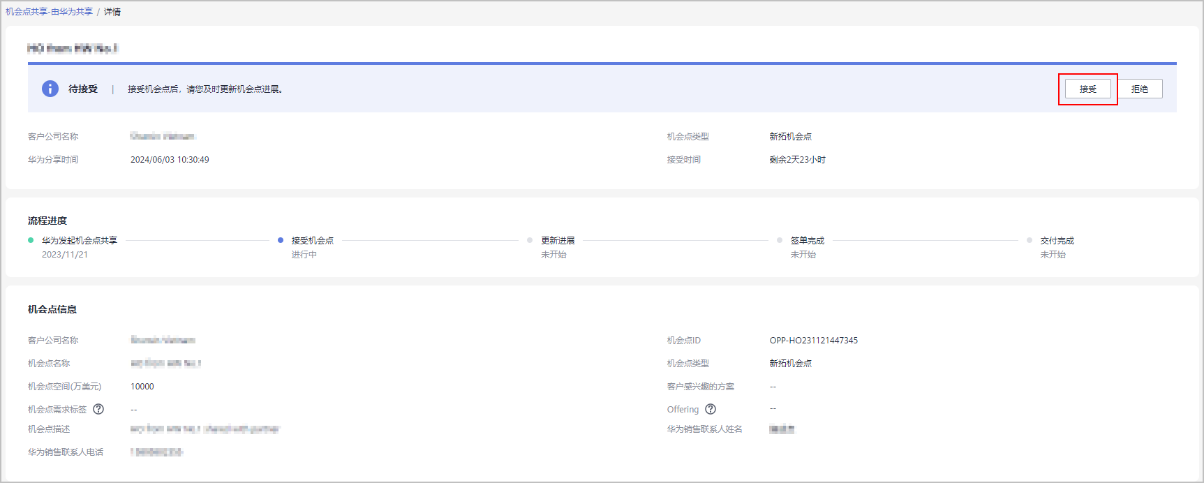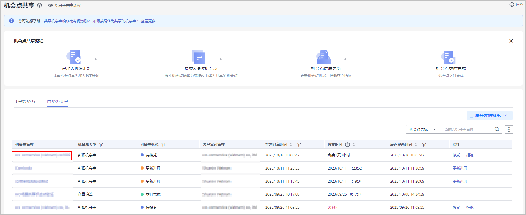 - 在“由华为共享”页签中,选择待接受的机会点,单击机会点名称查看详情。