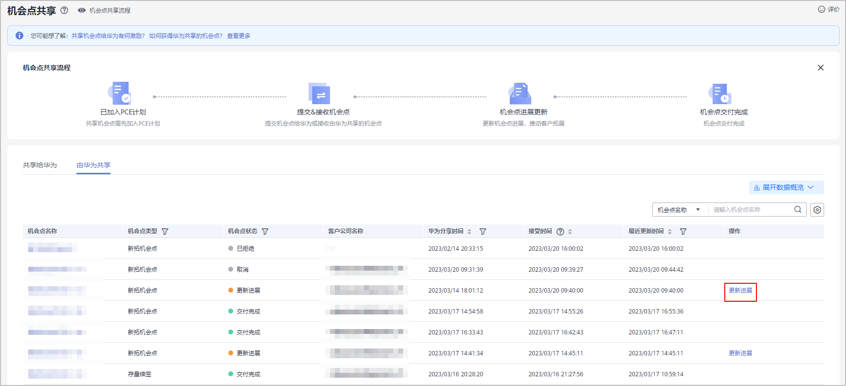 - 在“由华为共享”页签中,选择需要更新进展的机会点,单击操作列的“进展更新”。