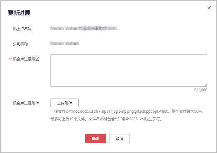 - 在更新进展弹框中填写机会点的进展,单击“确定”。