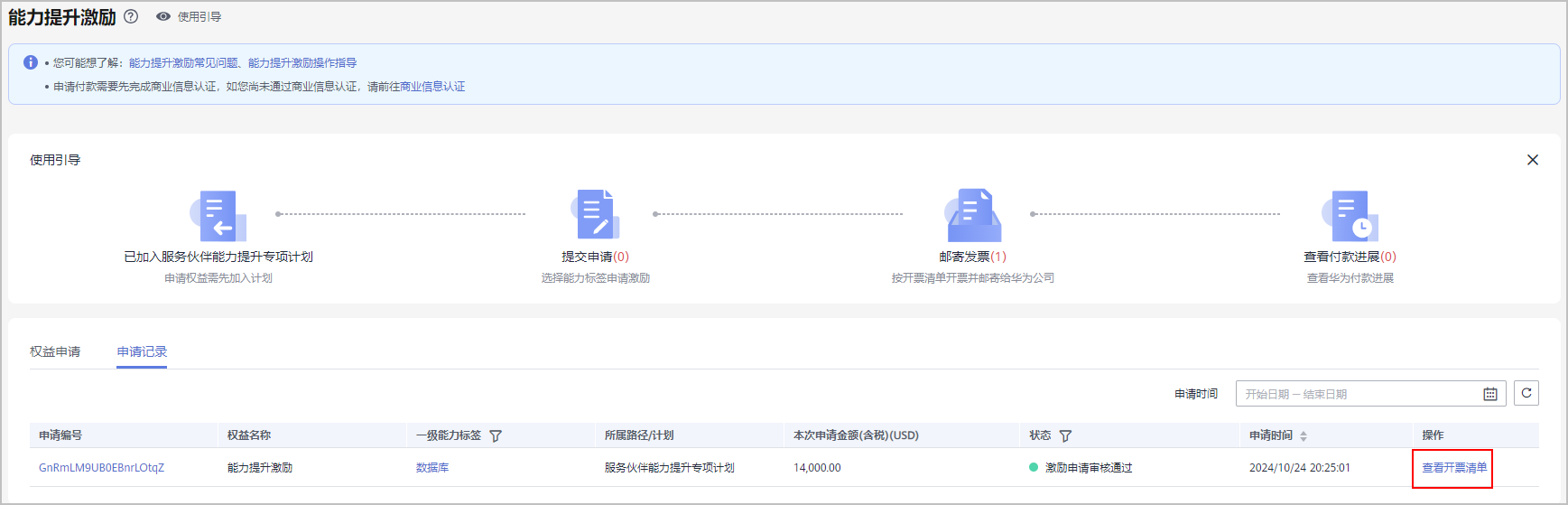 - 在能力提升激励“申请记录”页签中,选择状态为激励申请审核通过的权益,单击操作列的“查看开票清单”。